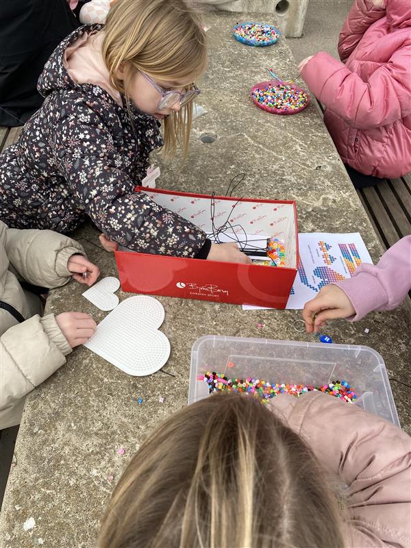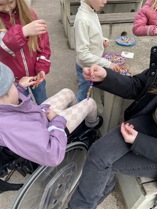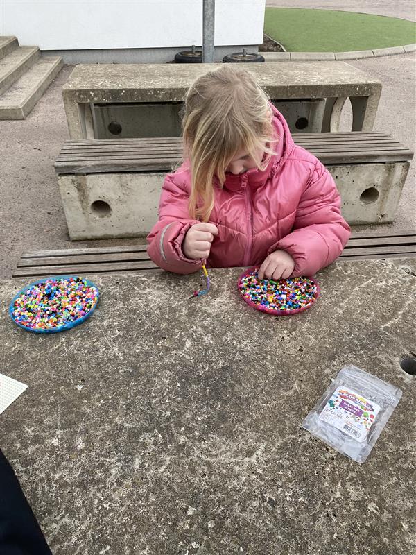 Idag flyttade vi ut skapandet i det fina vädret! Borden på skolgården fylldes snabbt av färgglada pärlor när eleverna satte igång med att designa sina egna pärlarmband.