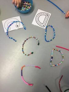 Bokstäverna C och D skapades med hjälp av piprensare och pärlor, lite klurigt tyckte en del men roligt att upptäcka att de kunde börja fram olika bokstäver av samma piprensare. Här tränade vi på fantasiförmågan och finmotoriken.