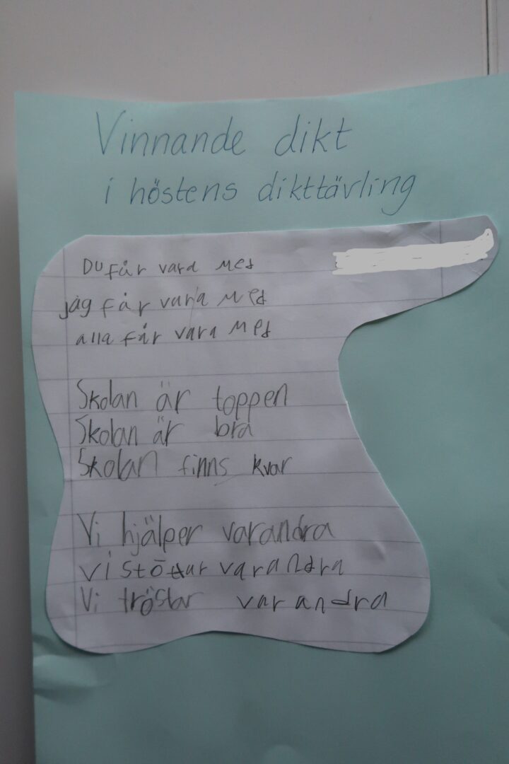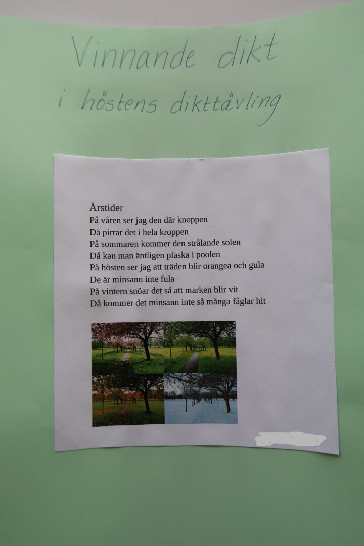 Hela skolan har varit aktiverade i vår första diktsamling. Det var många fina dikter vi fick läsa och har nu satt upp dikterna på många av skolans väggar för allmän beundran. Det blev dessutom två fina priser vi delade ut till den mest inspirerande och spännande dikten.
