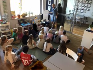 Sommartema med humlor, bin och solrosor. Vi har fått besök av professor Uggla som kom med ett stort mystiskt guldägg. Vi läser ugglans brev tillsammans och skriver tillbaks. Vi har också tränat på att skriva siffror och bygga tal. Ägget kläcktes igår och ut kom lilla kråkan Krax.