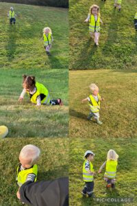 Vi tog oss ut på ängen utanför förskolan. Där var målet att få upp pulsen 💪🏼 Vi visade barnen hur man kunde springa upp och ner för kullen och sedan känna på sitt hjärta för att se om hjärtat börjar slå snabbare. Så småningom började barnen inse att man också kan krypa, rulla och kasa ner 👏🏼 Vi höll på tills vi blev törstiga och svettiga 💦 I samlingen innan maten pratade vi sedan om vikten att få i sig mat och att vila när man rört sig för att kroppen ska må som allra bäst! 😃