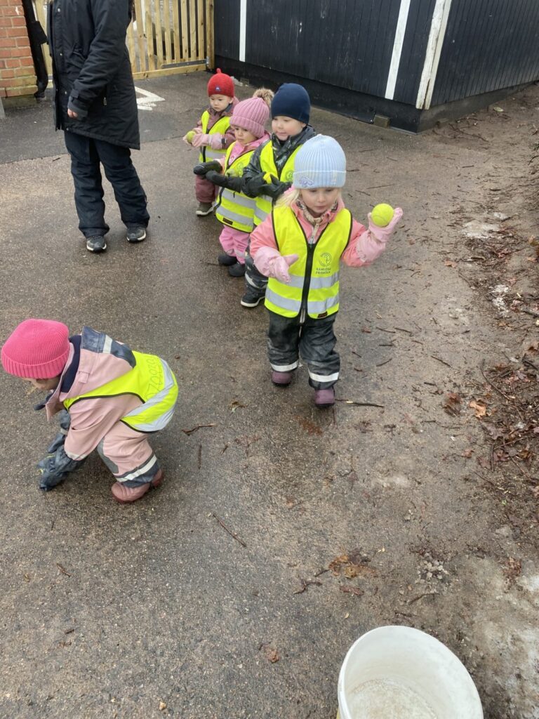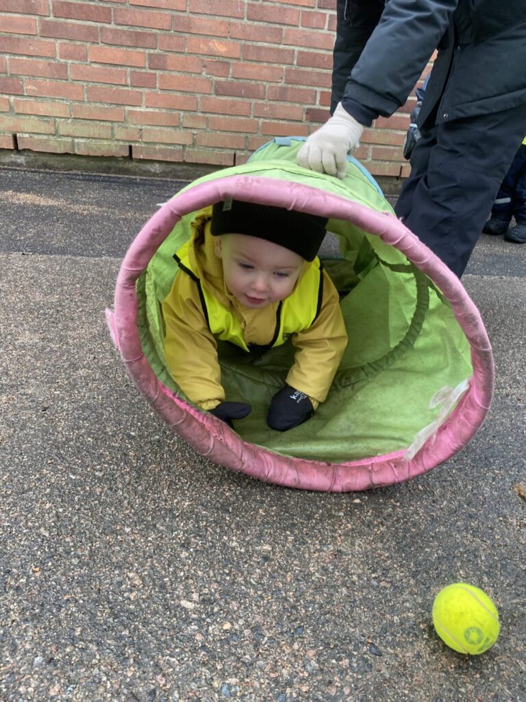 På station 3 fick vi både kasta bollar i en hink och krypa igenom en tunnel.