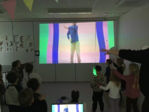 Vi provade dansgympa med en massa olika rörelser, vi fick bland annat vifta med höfterna, röra på armar och ben. Avslutningsvis blev det att dansa fritt till musiken.