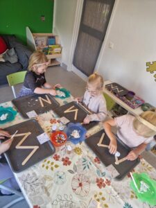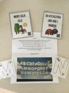 Skapande av M och N gjordes med hjälp av glasspinnar, lim, glitter och ögon. Barnen fick välja om de ville skapa M eller N och sen var det fritt fram att dekorera den valda bokstaven.