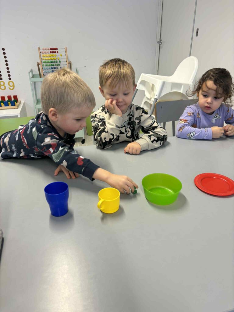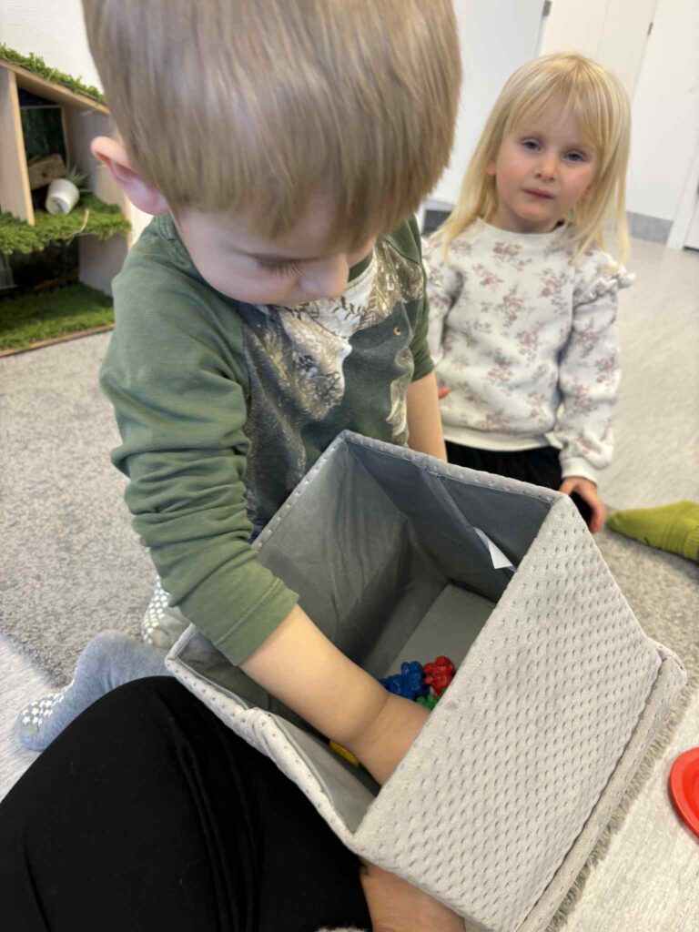 Under aktiviteten gick vi igenom fyra olika föremål i fyra olika färger. Därefter fick barnen plocka upp en nalle i taget ur en låda för att berätta vilken färg det var och sedan placera den vid föremålet som representerade samma färg. Vi gjorde detta några varv innan vi jämförde vid vilken färg det fanns flest respektive minst antal nallar. Vi jämförde även storleken på nallarna, vilken som va minst samt störst.