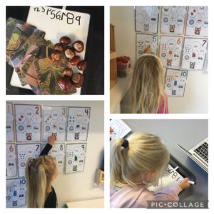 Barnen fick träna lite matematik och bekanta sig med siffror och begrepp som subtraktion och addition. De fick även möjlighet att skriva siffran. Detta gjorde vi genom att räkna med kastanjer som vi hade plockat från en utedag och på så sätt kunde vi knyta an till vårt tema.