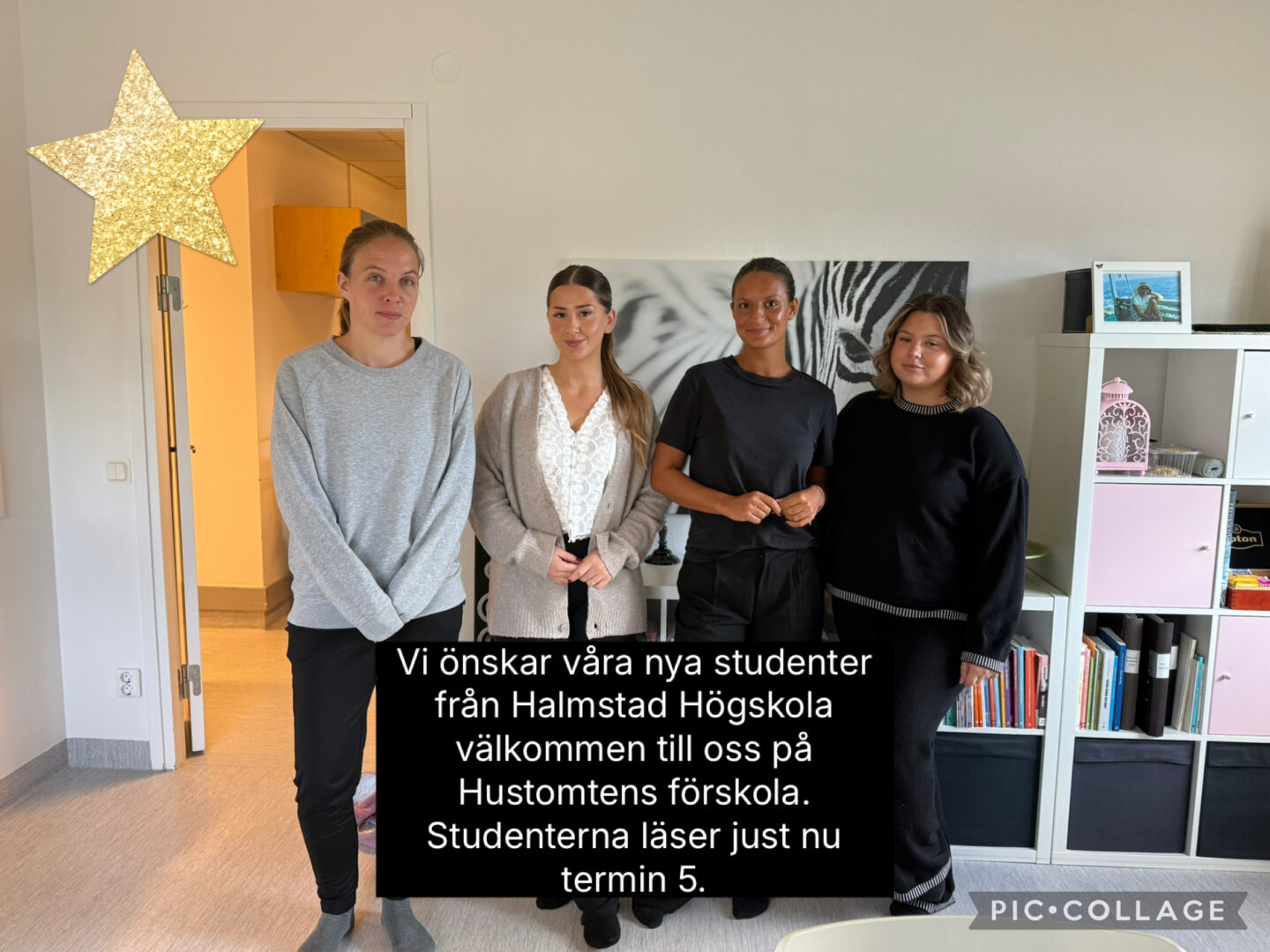 Då passar vi på och hälsar en ny student-kull från Högskolan i Halmstad välkomna till Hustomtens Förskola. Fyra nya studenter som ska genomföra sin praktik på vår förskola under deras tre sista terminer.