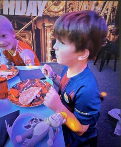 Idag har vi fått träffa vår kompis Pelle igen. Under helgen har han varit hemma hos en av pojkarna i klassen. Och det har varit en fartfylld helg med mycket kalas. Pelle har fått vara med på kalas på jumpyard, och det tyckte han var jättekul. Dessutom gömde sig Pelle i en sifferballong, och han hade lite svårt att komma ner igen. Pelle fick även en ny kompis, Pelle tyckte att familjens katt var en trevlig prick. Sen fick vi ett nytt boktips, vilket alltid är kul.