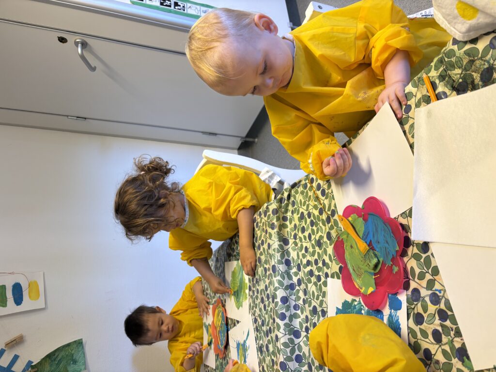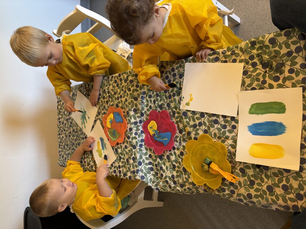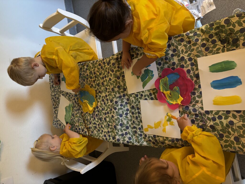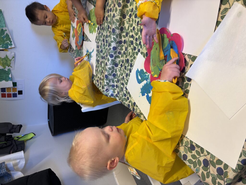 Barnen har återkommande under terminen fått skapa och uttrycka sig genom målning. Målningen ger barnen möjlighet att utforska färger och olika typer av material på ett kreativt sätt. Fokus ligger på att utveckla deras färgkännedom samt den sensoriska upplevelsen av att arbeta med olika material och verktyg.