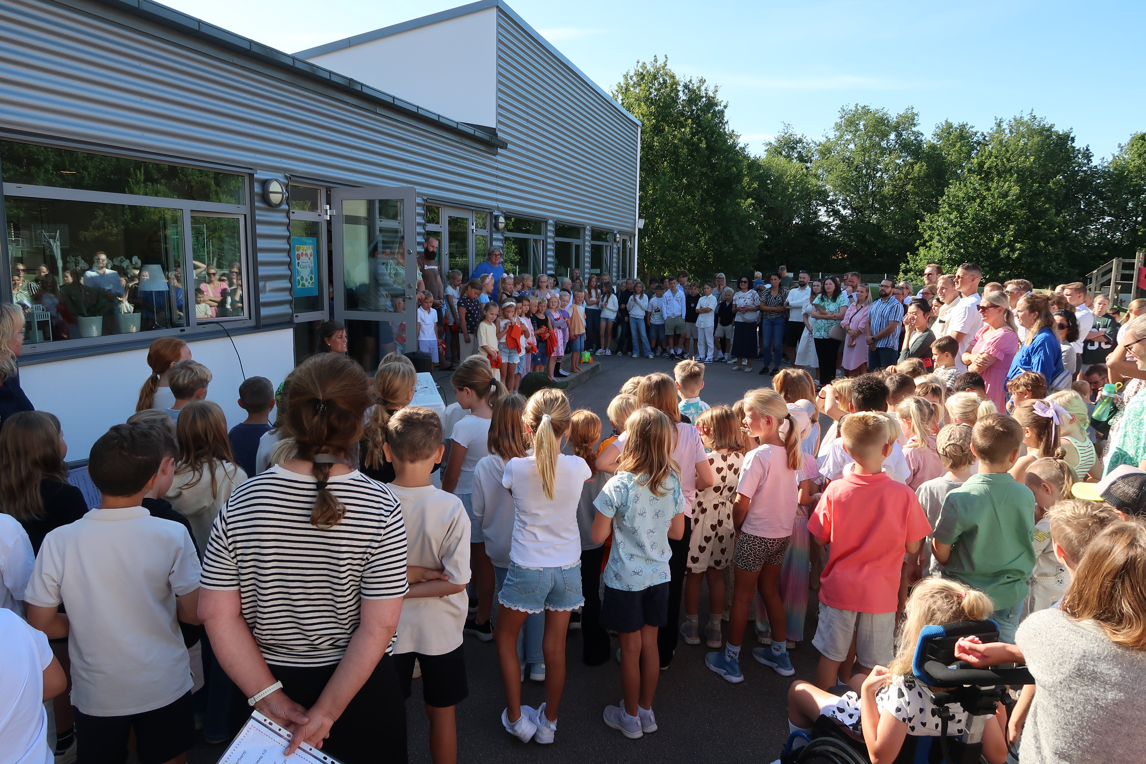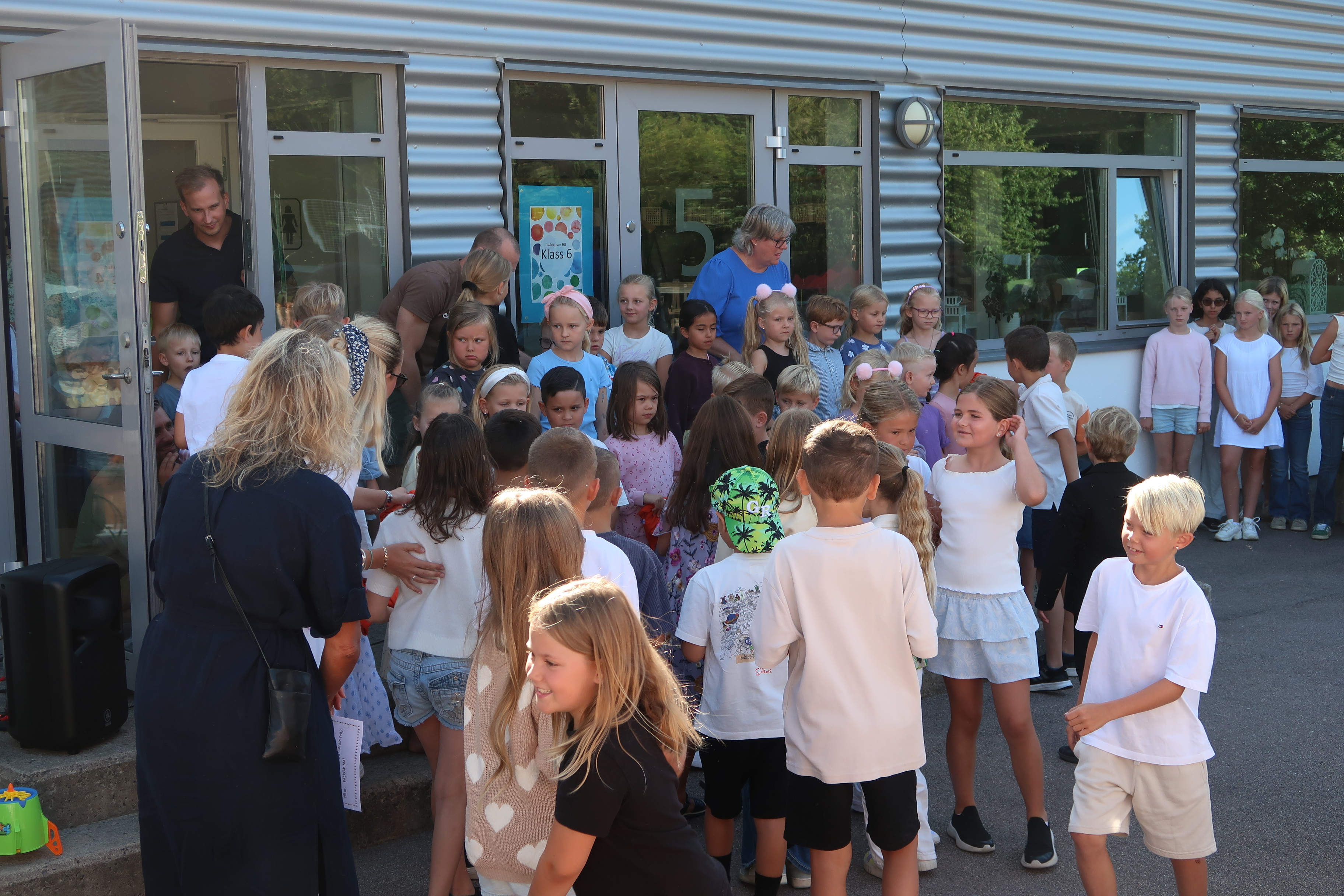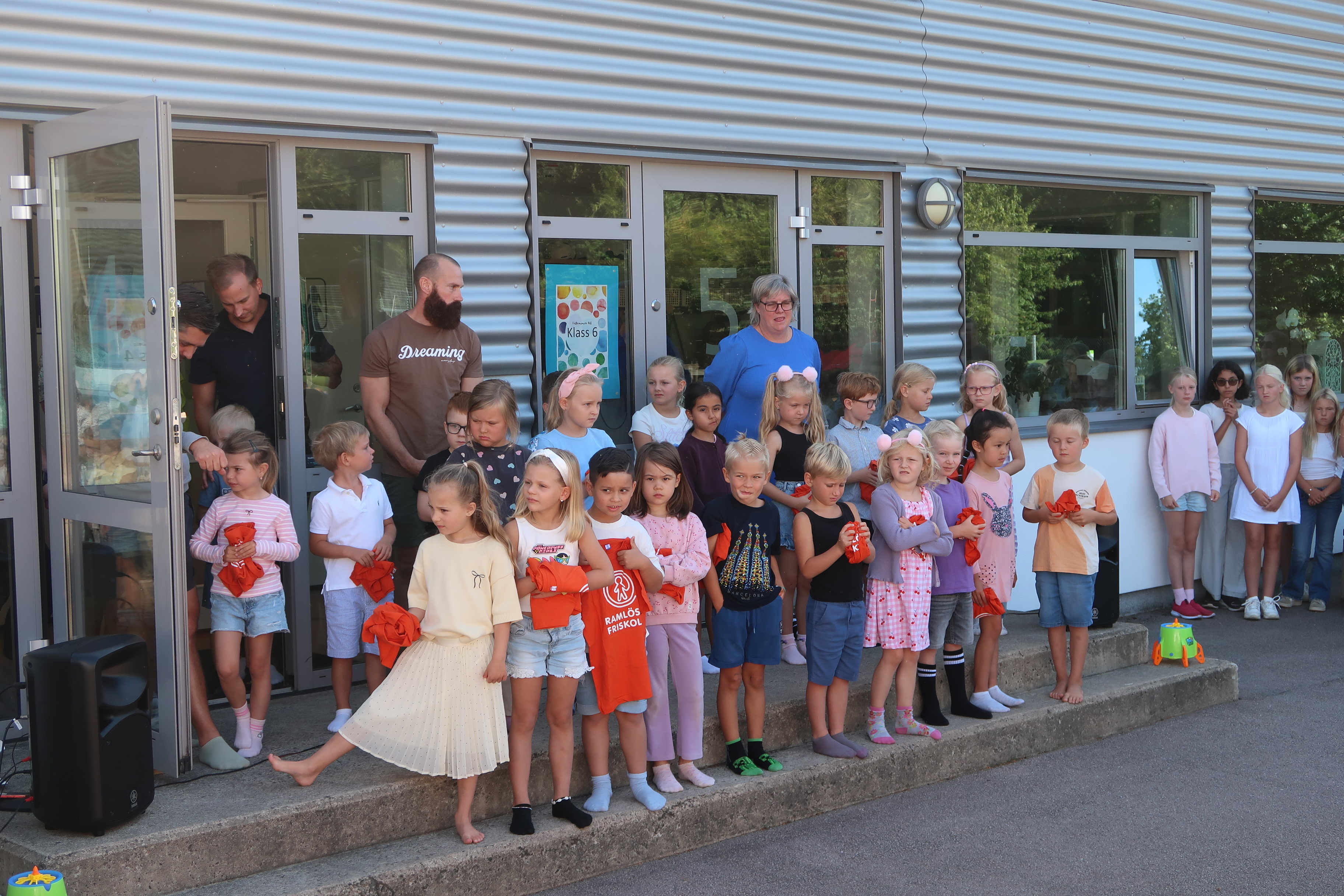 Åk 3 blir förskoleklassens faddrar och hälsar hela förskoleklassen välkomna till Ramlösa Friskola. Det sägs några vackra och värmande ord samt sjöngs en del fina kompissånger.