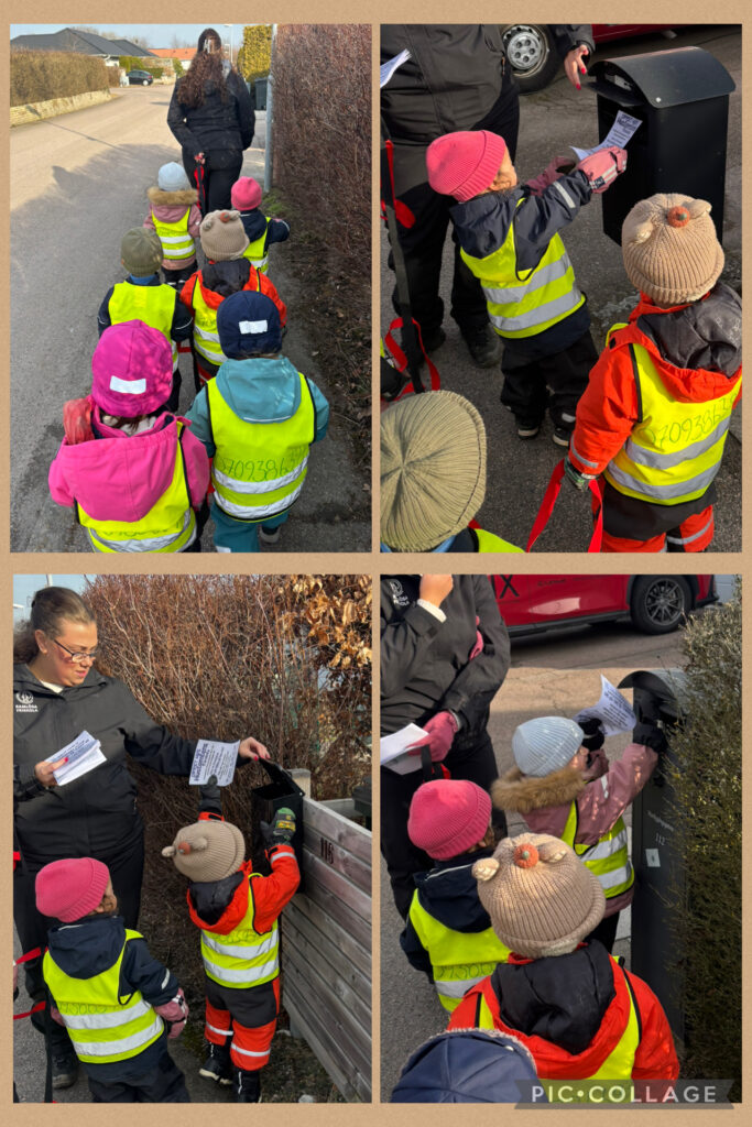 Solstrålen blev brevbärare för en dag. Vi gick på en promenad i närområdet och delade ut flyers i området angående vårt öppet hus nästa vecka! Barnen tyckte det var väldigt spännande och letade spänt efter fler och fler brevlådor. När vi kom tillbaka sa barnen att det var roligt, kul och spännande att dela ut post. Samtidigt som vi delade ut post övade vi på samarbete genom att gå och hålla i repet samt trafikregler som vi alltid pratar om när vi rör oss i trafiken.