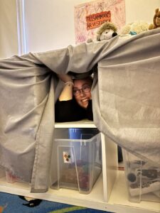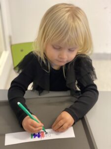 Det gjorde vi genom att måla en namnskylt med barnens eget namn på som sedan blev en gemensam tavla.