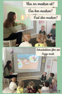 Vi startade upp temat med att barnen fick titta pĂ„ en kort fakta film/ sĂ„ng om âSigge maskâ. Efter filmen samtalade vi om masken och lite om dess liv.Â