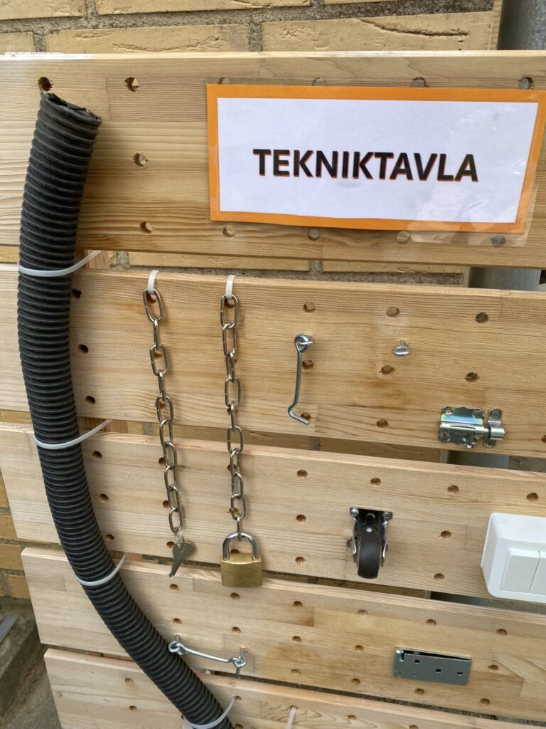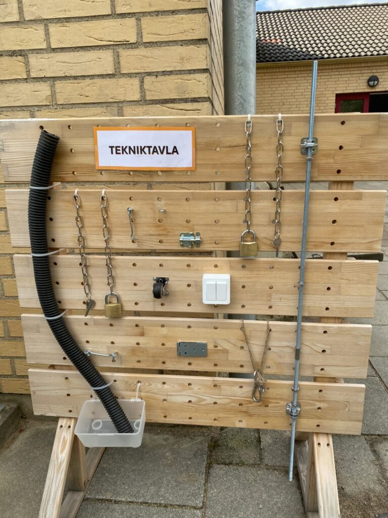 Vi ger er….. TEKNIKTAVLAN. En av våra fantastiska pedagoger har skapat en tekniktavla som vi gemensamt med regnbågen har ute på gården för att ge alla barnen möjligheter att utforska teknik under sin vistelse på förskolan. Teknik i förskolan är viktigt för att barn ska utveckla sin nyfikenhet, kreativitet och förmåga att lösa problem genom att utforska och undersöka. Det ger barnen en förståelse för hur saker fungerar och hur de kan påverka sin omvärld, vilket förbereder dem för ett liv i ett teknologiskt samhälle. Utöver tekniktavlan tar vi tillvara på tillfällena som ges under dagarna på förskolan och pratar om teknik som barnen möter på daglig basis – exempelvis dragkedjan på jackan, stövelknektens funktion, hur man öppnar/stänger lådor vi har material i etc.