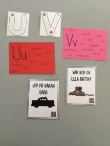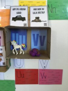 Vi hälsar U och V välkomna till vårt bokstavshus. De hade med sig en unicorn och låtsas vindruvor när de presenterades för barnen. Tillsammans försökte vi komma ord som börjar på u och v, barnen tyckte det var lättast att komma på ord som börjar med v. Det blev två ”nya” sånger, uppe på vår gård och var bor du lilla råtta som vi med hjälp av qr-kod lyssnade och sjöng. Barnen har tränat på hur bokstäverna låter samt skrivit dem.