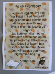 Denna vecka har en uggla som heter Umi flyttat in i vårt träd. Umi gillar att läsa böcker och kommer följa med barnen hem på ett läsäventyr. Denna undervisning bidrar till ökad läsförståelse, språkutveckling, fantasi och ett fint samarbete mellan hem och förskola. Vi ser fram emot att läsa många ”nya” böcker och äventyr 📚🦉