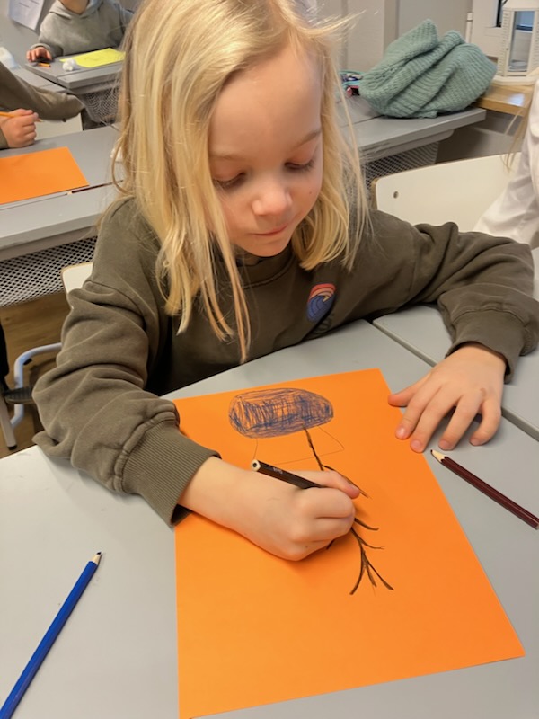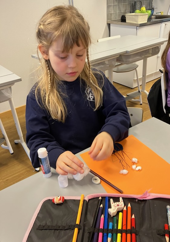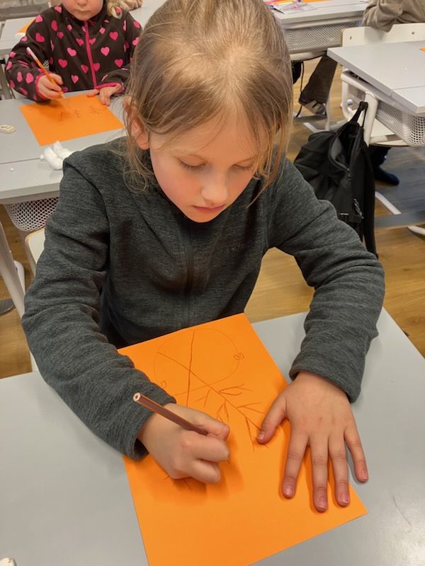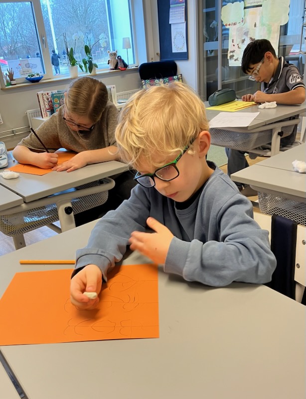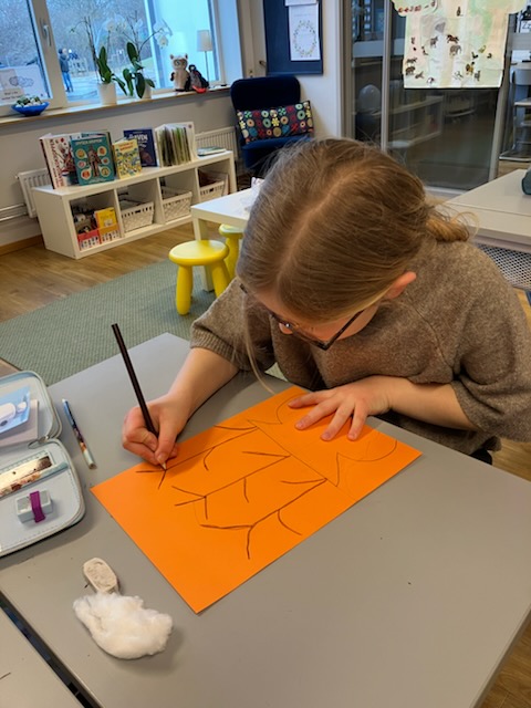 Med hjälp av bruna pennor, färgat papper och mjuka bomullstussar har eleverna skapat fantastiska vaser fyllda med vårkvistar. Det var härligt att se koncentrationen när de små ”knopparna” limmades fast en efter en!