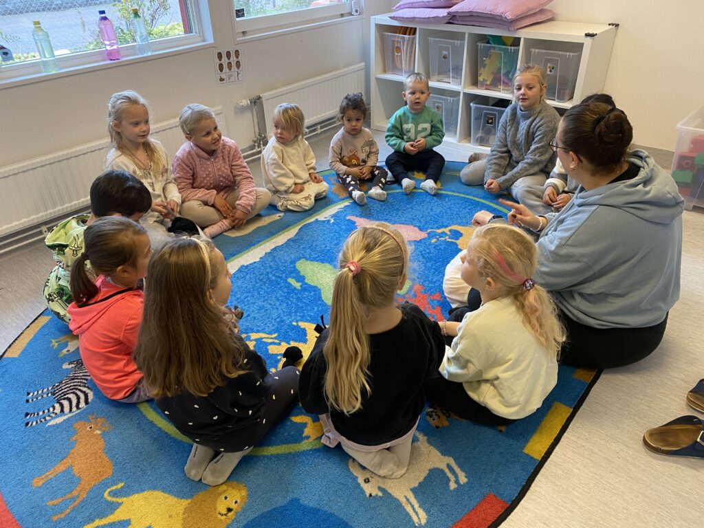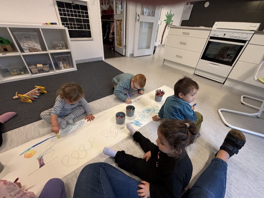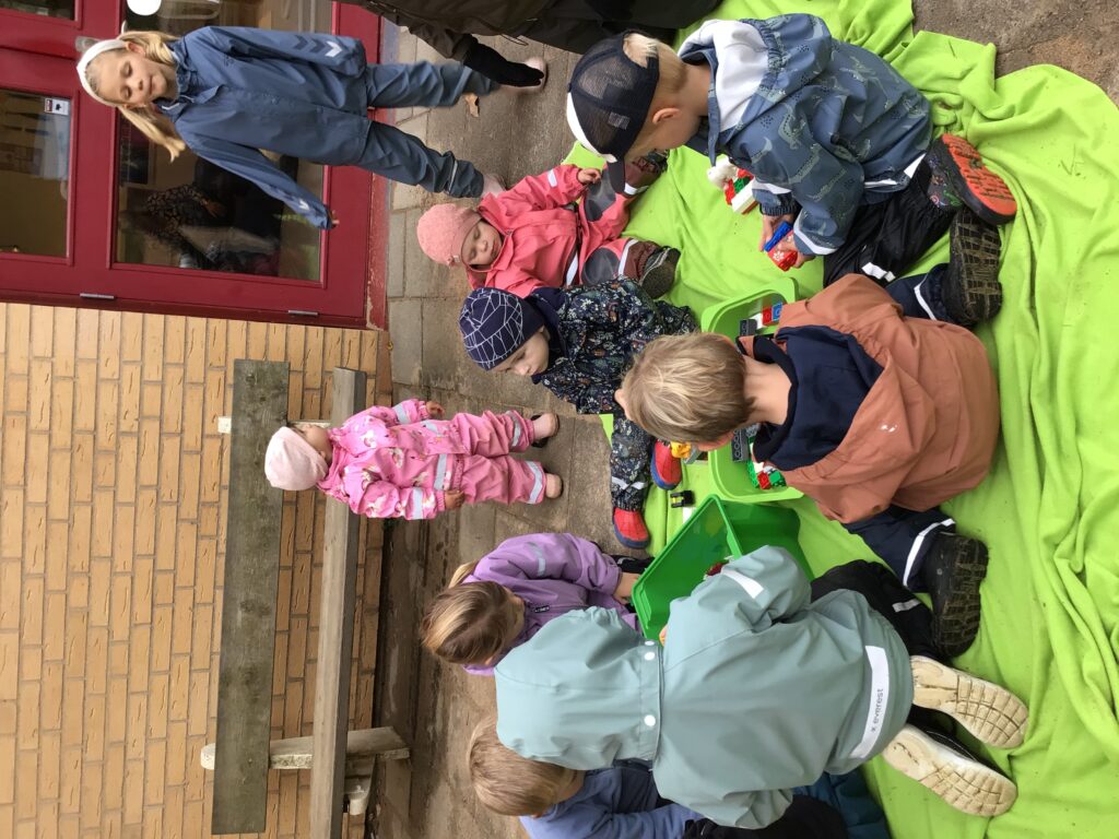 Vi delade in oss i tre grupper där en grupp hade samarbete med bygg och konstruktion utomhus. En grupp hade en sångsamling där alla fick sjunga sina namn och sen en och en ta ett djur ut vår sångpåse. Den tredje gruppen gjorde en gemensam teckning fylld av hjärtan, regnbågar och abstrakt konst.