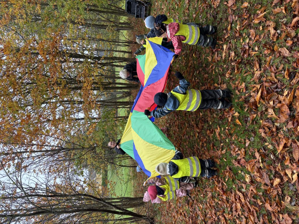 Vi tog oss till dungen vid hästgården och samarbetade med hjälp av en fallskärm. Barnen tyckte det var väldigt roligt speciellt när vi pedagoger ”fångade” barnen under.