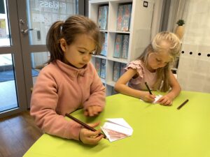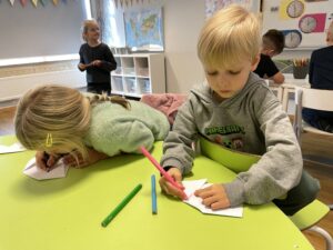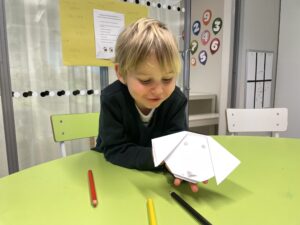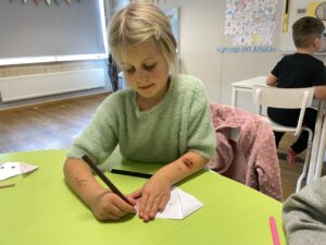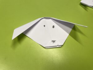 Idag har vi gjort söta hundar genom att vika ett papper utifrÄn instruktioner som visades pÄ tavlan. Visst blev dom fina ?