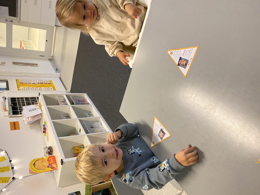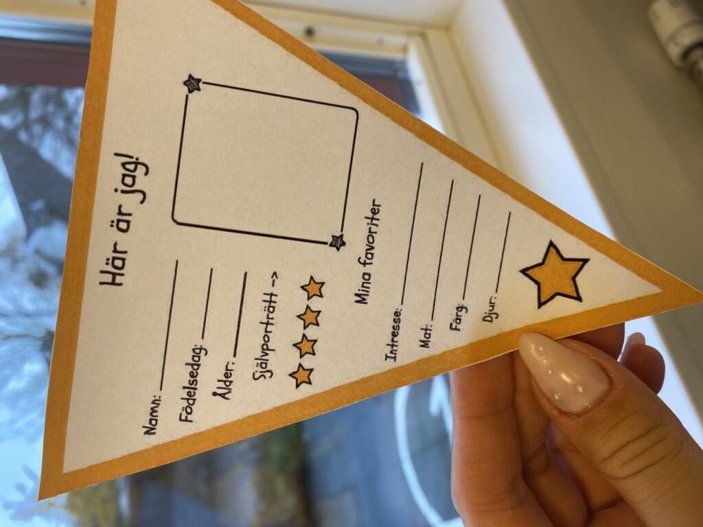 Sedan fick barnen en och en klistra på sin bild på sin vimpel och sedan hade vi en miniintervju med frågorna på vimpeln som barnen fick svara på. För de barnen som inte verbalt kunde svara på frågorna hade vi skapat bildstöd som de kunde använda sig av.